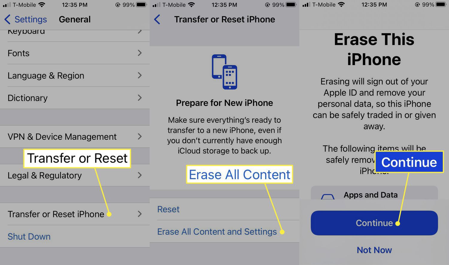 Erase your device. Go to Settings > General > Transfer or Reset iPhone. Choose Erase All Content and Settings > Continue. After you enter your passcode or Apple ID/Apple Account password, your device will erase. This can take a few minutes.