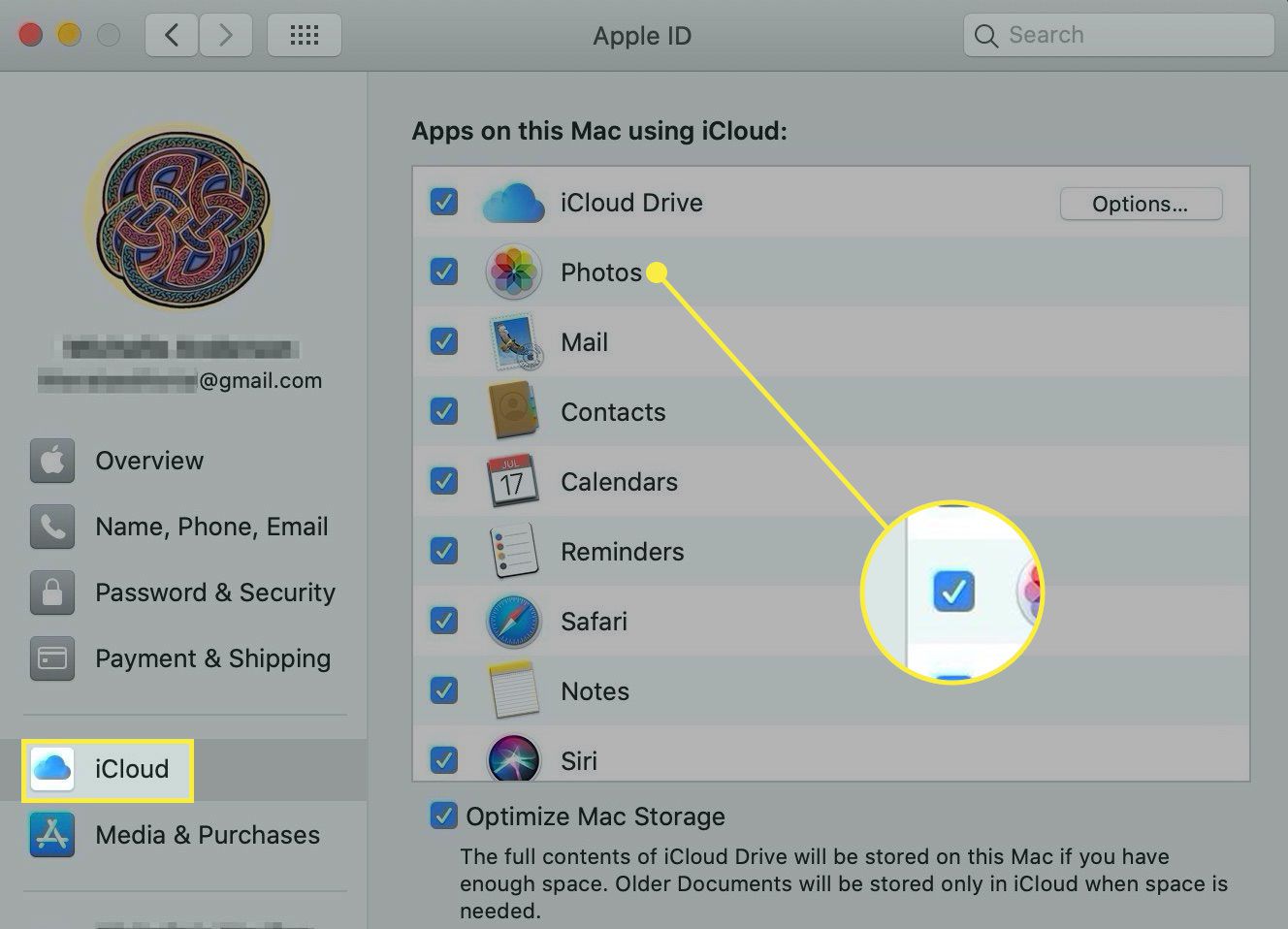 In the left pane, select iCloud. Then, under Apps on this Mac using iCloud/Apps Using iCloud, select Photos.