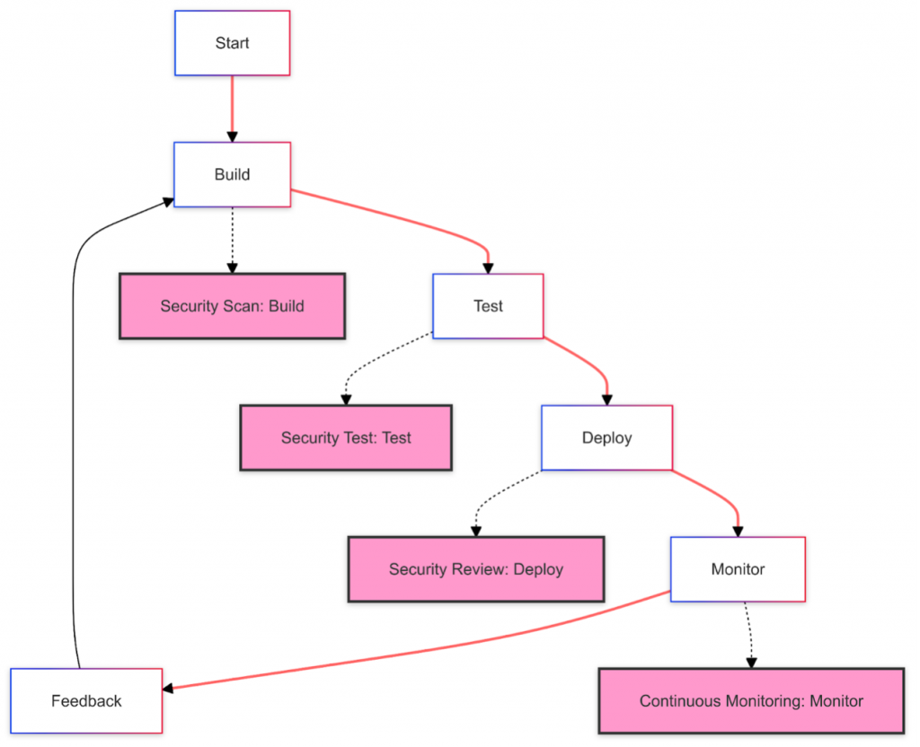Automated Security Pipeline in DevOps: This cyclical process-from code commitment through security checks to deployment-ensures rapid and secure software delivery.