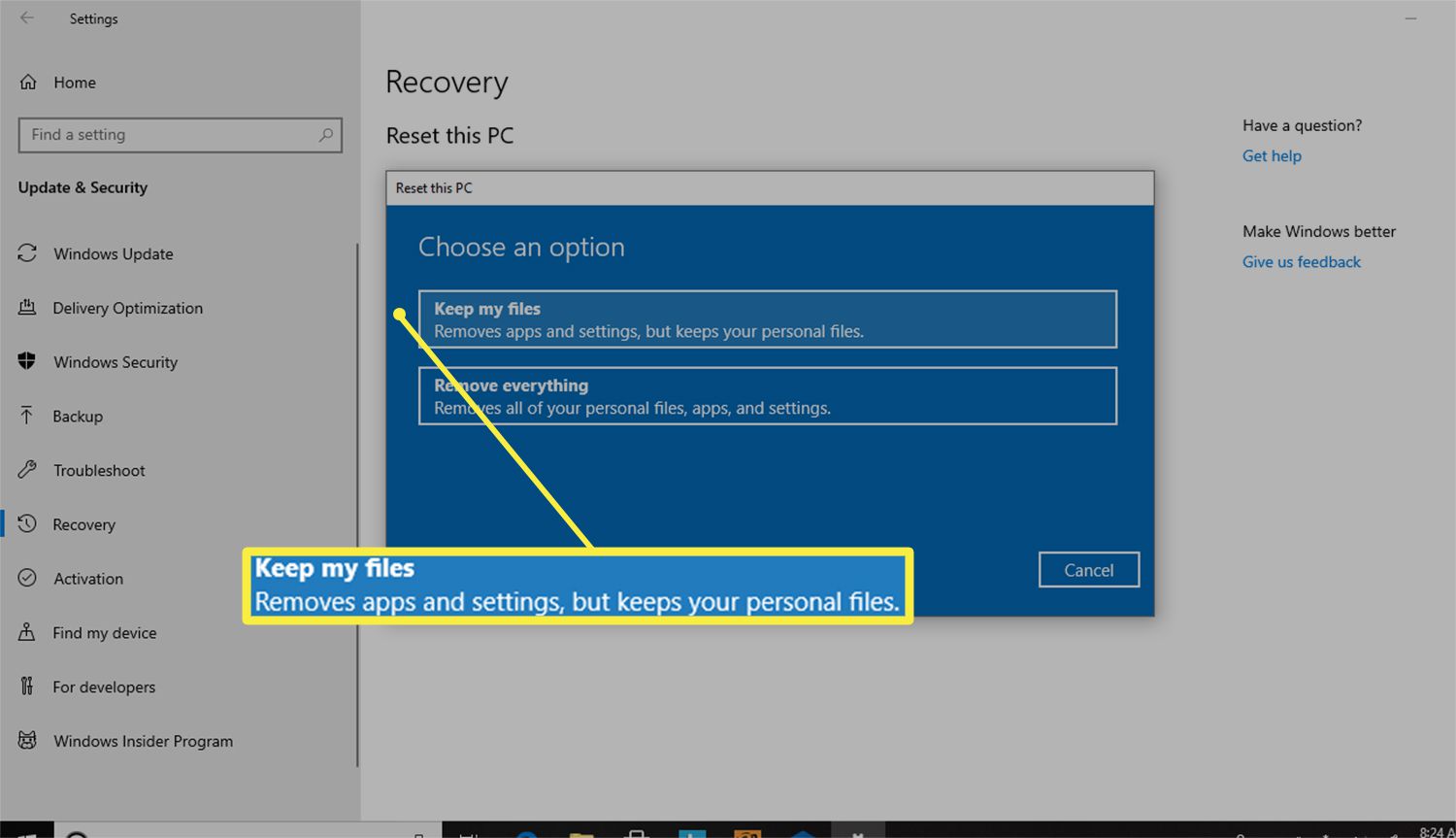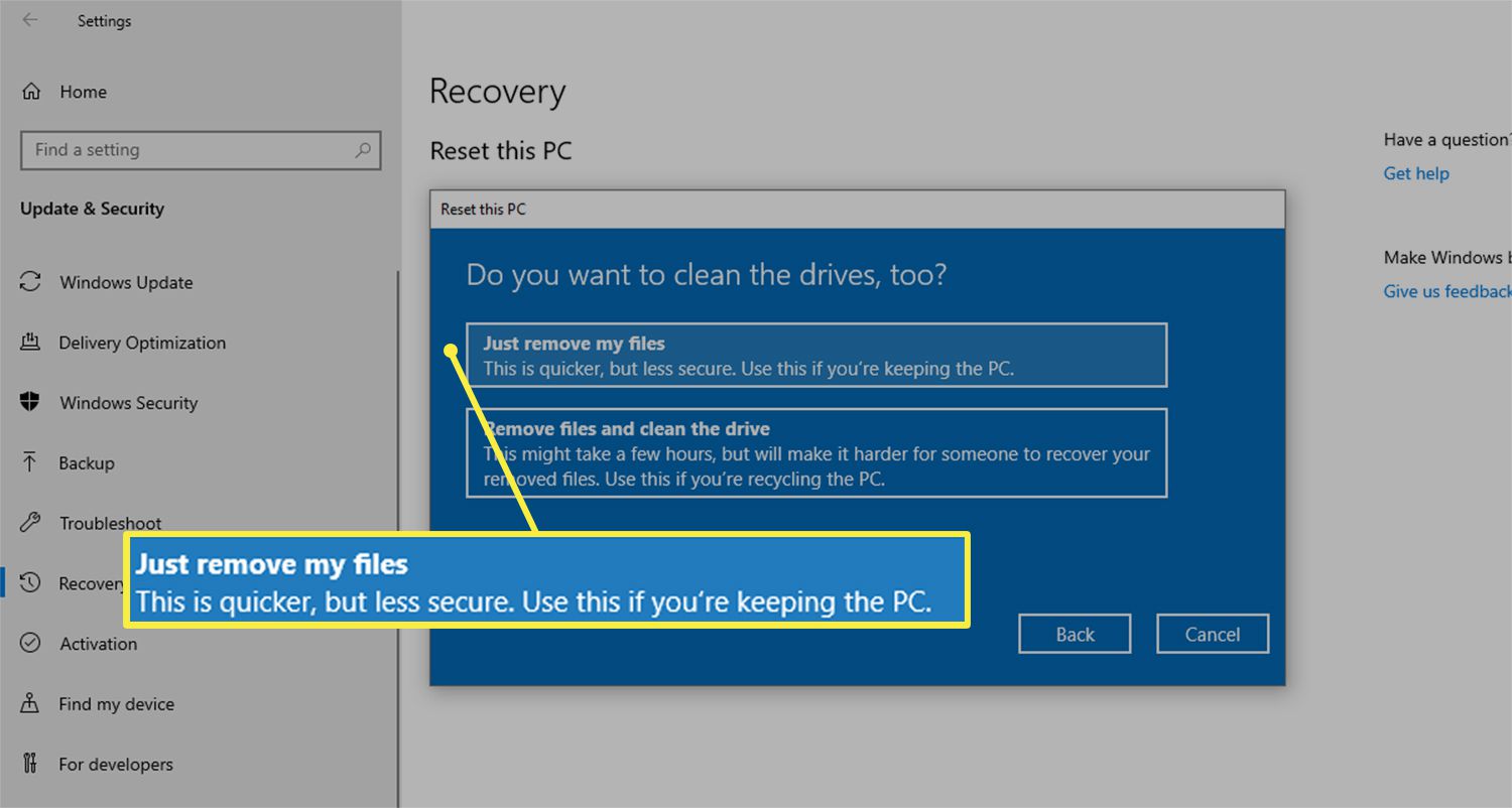 This option is the faster of the two, but it's potentially less secure if you'll be giving your laptop away. You may want to opt for the longer but more thorough option to remove all files and clean the drive.