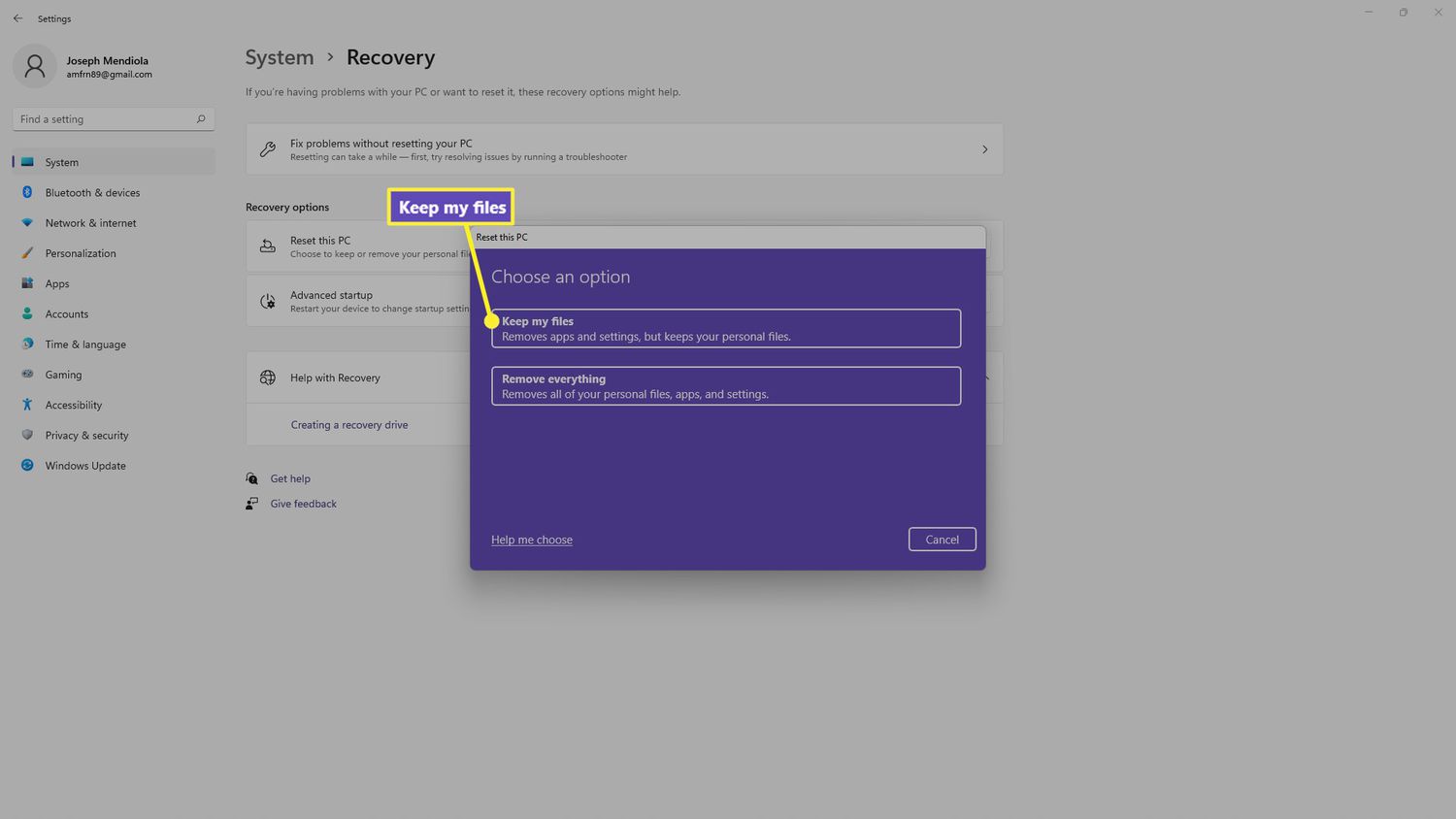 - Choose whether to keep your files or delete everything and reinstall Windows.