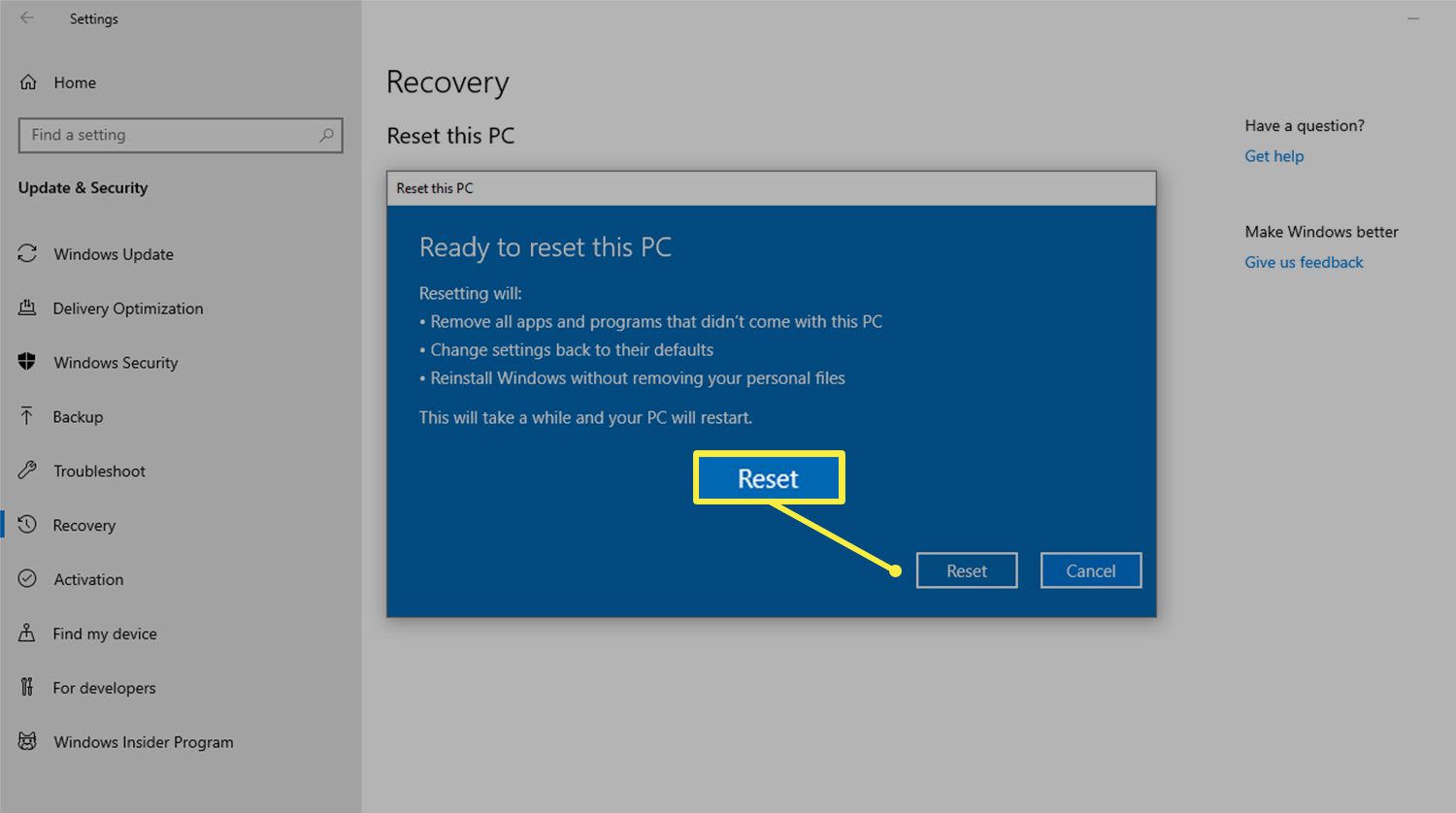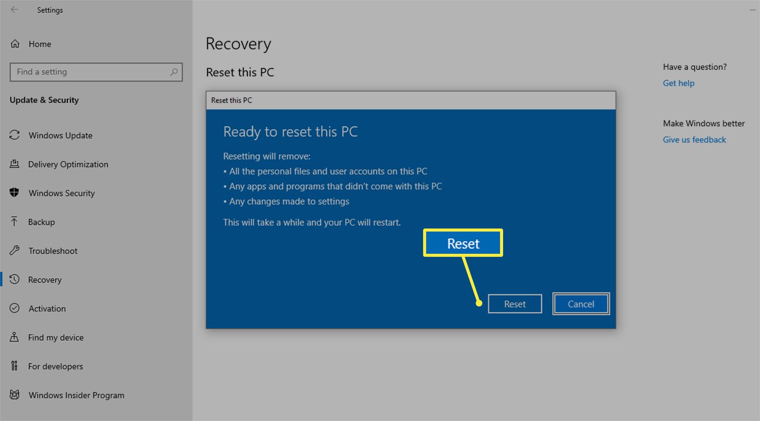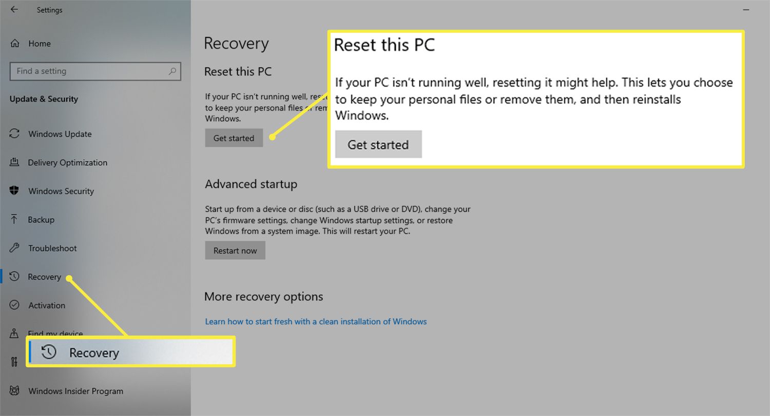 - On Windows 10, go to Settings > Update & Security > Recovery > Get started.