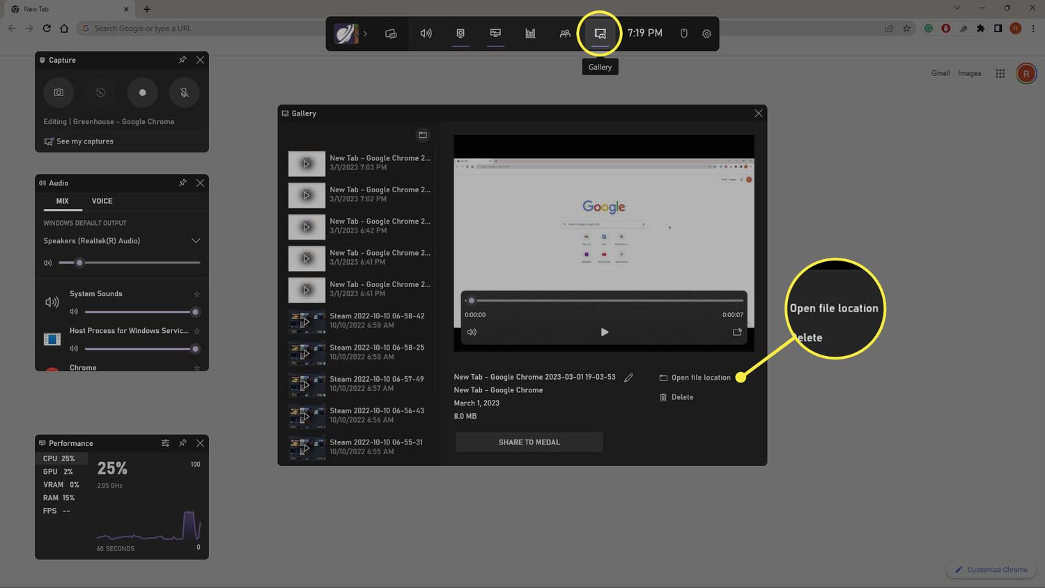 The Xbox Game Bar Gallery will open with a preview of your recording. If it doesn't appear automatically, select the Gallery icon (the game controller and film). Select Open file location to view the video in File Explorer.
