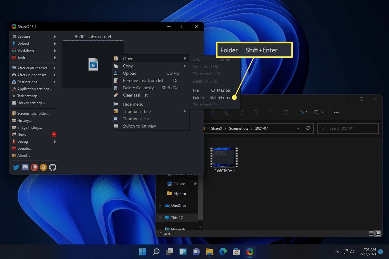 Select your recording in ShareX to view it, or right-click the file and select Open > Folder to open it in File Explorer.