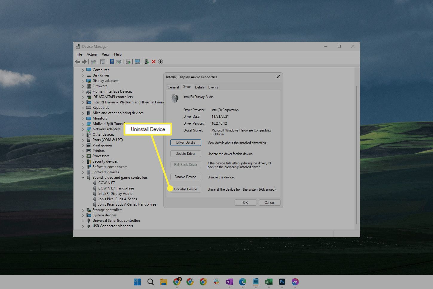 From the Driver tab, select Uninstall Device, and then Uninstall from the confirmation box.
