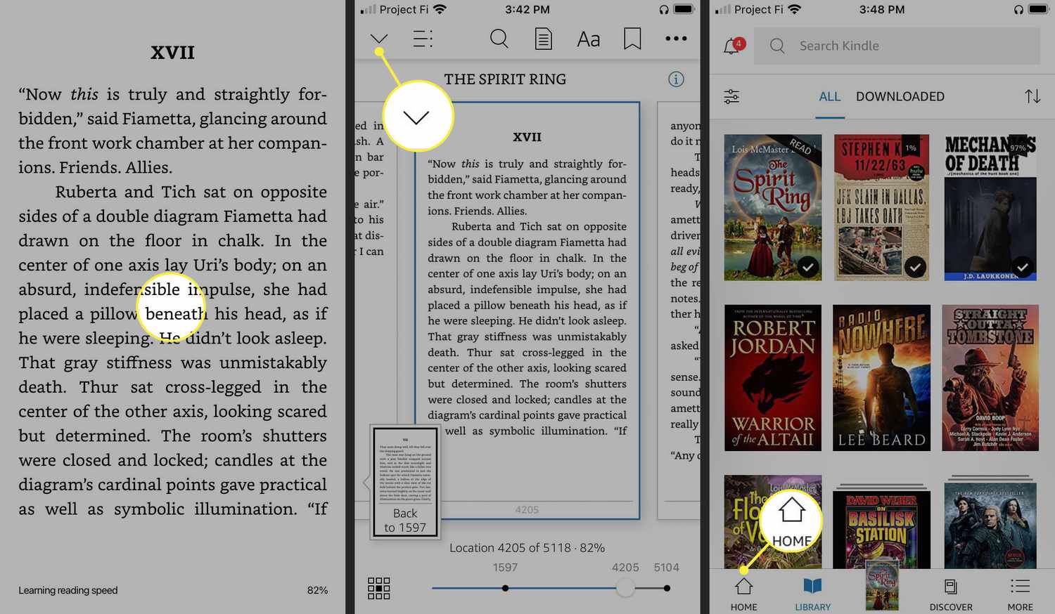 - In the Kindle app: Tap the middle of the page, tap the down arrow, then tap the house icon if necessary.