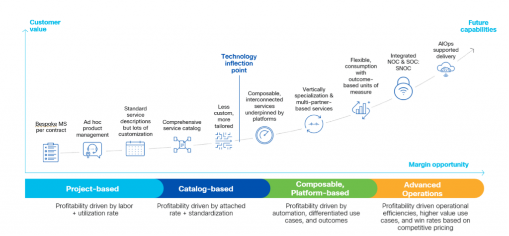 To understand this evolution and its implication for providers, let's look at the Cisco Managed Services Maturity Continuum.