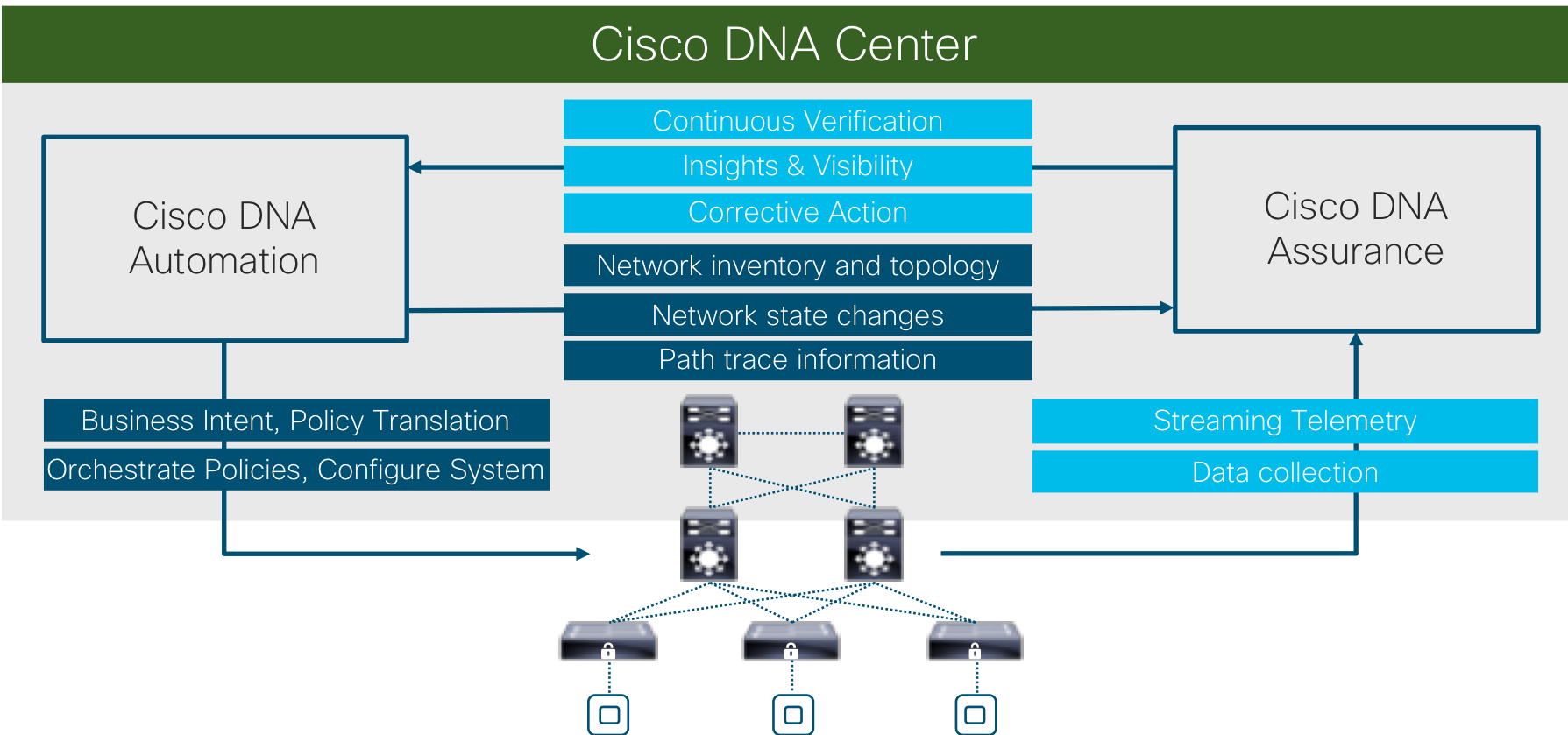 Cisco DNA Center is the single pane of glass where all of this comes together. It is the single point of Orchestration, Automation, and Assurance for the network.