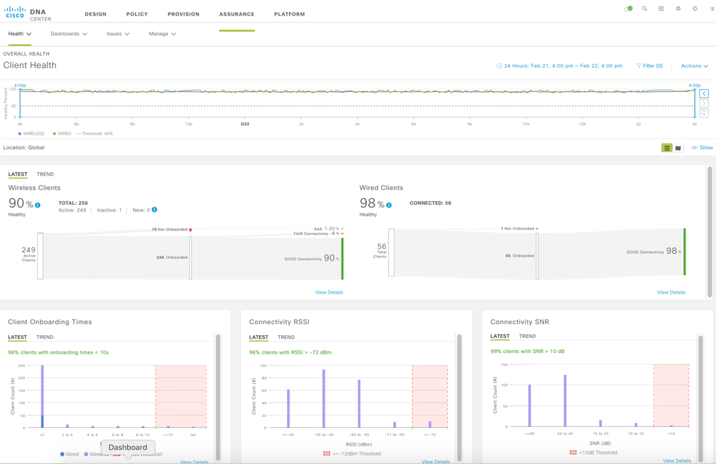 Cisco DNA Center is also the place where the network can be designed, policy is created, and devices are deployed in the network, for SD-Access (fabric based) and non-fabric based environments. Next time we'll explore DNA Center a bit closer. In the meantime, here is a teaser showing Wired and Wireless Client Health in DNA Center.