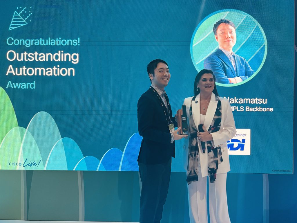 The Outstanding Automation Award goes to a customer who partnered with Cisco CX to dramatically improve IT operations through automation. The winner is Japanese telecommunications service provider KDDI. Through collaboration with Cisco customer success, Takumi Nakamatsu, Architect of IP/MPLS Backbone, and his team at KDDI are transforming and modernizing network operations by combining generative AI and Cisco Network Services Orchestrator (NSO). They are also working to remove manual tasks and simplify pre-deployment tests with the goal of reducing total manual tasks by more than 50 percent.