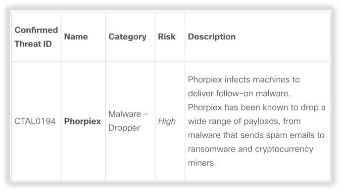 New alerts created via this threat intelligence will show up as "Confirmed Threat Watchlist Hit" alerts. These alerts can include named malware type families and also provide details on what they do (exfiltration, exploit, content distribution, botnets, ransomware, etc). Some of the threat intelligence provided by the Confirmed Threat Service is created in collaboration with Cisco Talos. Talos will seed intelligence (initial set of seed IOCs), title and description of a threat. Cognitive Intelligence will then expand this seed set of IOCs with new occurrences using information gathered from IDPs and machine learning -which in turn yields new IPs and domains that are also related to the given threat and appear in real customer telemetry.