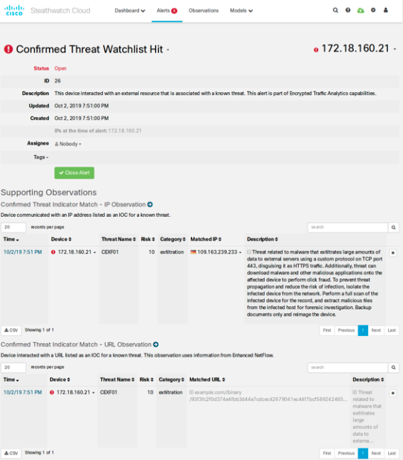These integrations allow Stealthwatch Cloud to ingest ETA telemetry from supported Cisco networking devices and provide additional, enhanced fidelity of encrypted (as well as non-encrypted) traffic. From there, ETA will alert users of potential threats that might be hiding in encrypted traffic. These alerts include cryptomining, unpublished TOR, botnets, Ramnit, Sality, malicious file download, phishing and typosquatting and more.