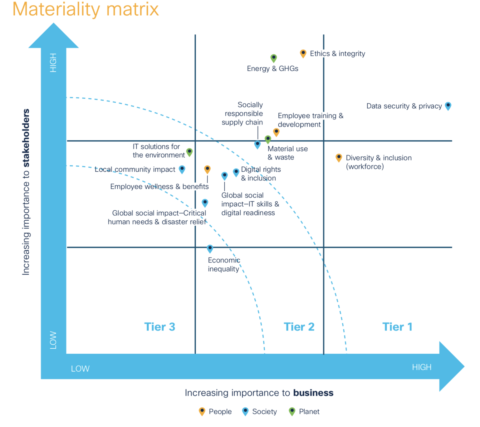 An important input to report content and CSR strategy is a materiality assessment. The assessment helps us understand what issues are most important to stakeholders inside and outside Cisco. We conduct a full assessment every two years. In years that we do not conduct a full assessment, we do an internal materiality refresh. This helps us validate priorities relative to business risks and opportunities. Each year, we provide results to the Cisco Governance, Risk, and Controls team, which feeds into Cisco's ERM program.