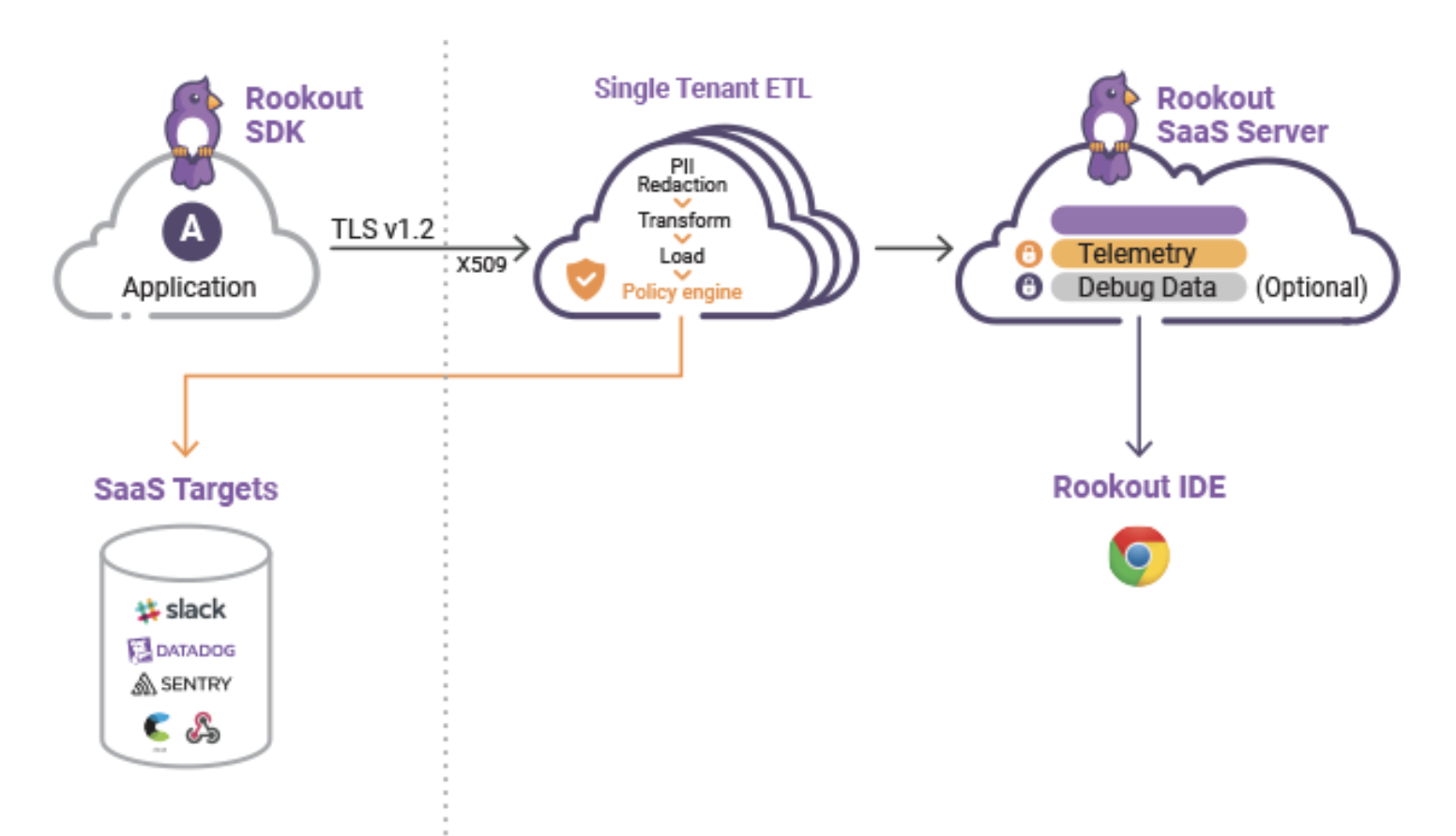Rookout runs as a SaaS-based application with deployment options available for keeping data on-prem based on your needs. Data collected from Rookout can also be sent to any external logging or monitoring system, or any system that has an API exposed. Here is a sample architecture diagram showing how Rookout works and communicates with various components in your environment.