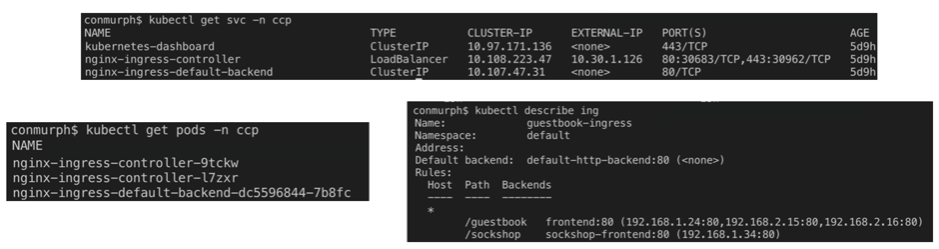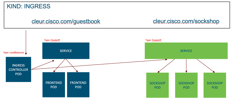 From there the Nginx controller will redirect based on the path, either to the guestbook frontend service or the sockshop service. These will in turn forward the traffic onto an available pod managed by the respective service.