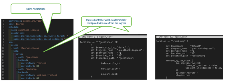 In this lab Nginx has noticed the new ingress defined and has created the routing rules and annotions as part of it's configuration. We can confirm this by looking at the nginx.conf file on each nginx-ingress-controller-xxxxx pod.