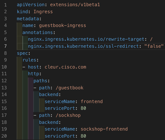 From the YAML file above we can see a set of rules defining two http paths, one to a Guestbook and one to a different application called the Sockshop.