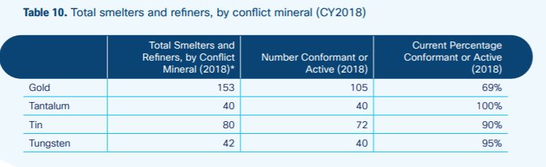 Through the Supply Chain Human Rights Governance Committee, we regularly notify Cisco's supply chain leadership of our progress. If a supplier does not attempt to comply with our Responsible Minerals Policy, we may escalate the supplier to global supply chain management and possibly remove them from our supply chain. In 2018, 81 percent of the identified 3TG SORs for current products had been audited by or were active in the RMAP process. For more information, see Table 10. The Conflict Minerals Disclosure and Report, published in May 2019, describes in detail how our due diligence activities align to OECD Guidance.