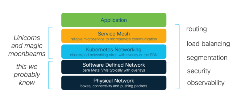 The above poses the question: is a service mesh a network layer? Well... Kind of. The service mesh ensures that communication between different services that live in containers is reliable and secure. It is implemented as its own infrastructure layer but, unlike K8s, it is aware of the application. Some of the capabilities it delivers to the application are recognisable network functions such as traffic management and load balancing, but these are executed at the microservices layer, and need that intimate knowledge of the application and its constituent services. Equally, the service mesh relies on lower level abstractions to deliver network functions as well.