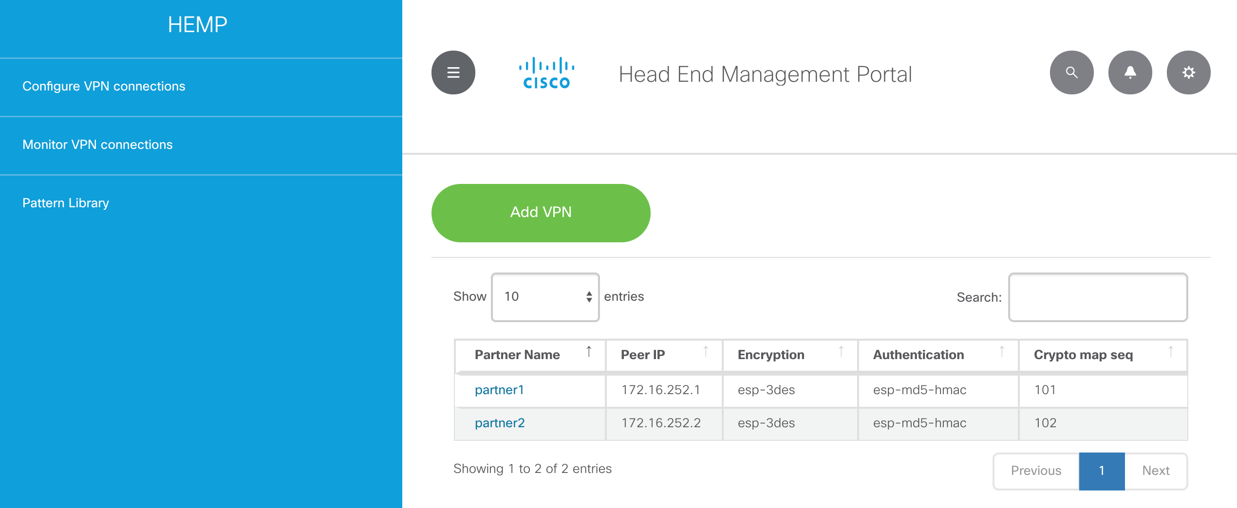 Please click on Configure VPN connections and there you will see the ones already configured on the headend router: partner1 and partner2.