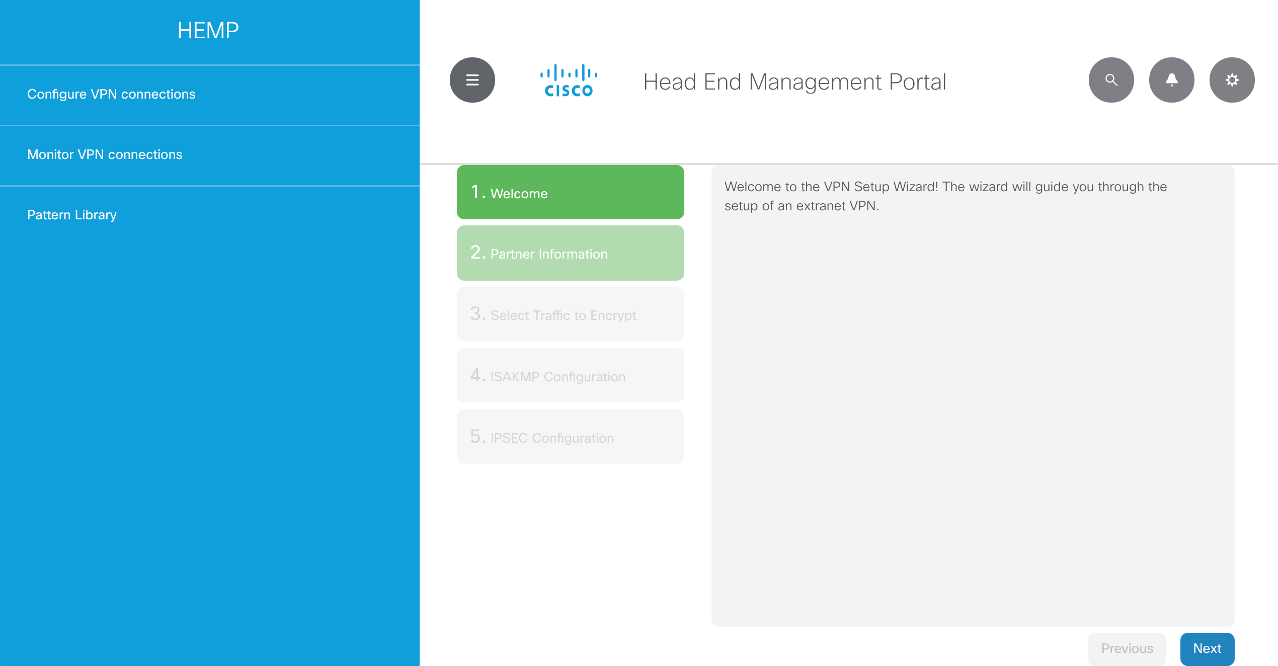 Now let's go back to Configure VPN connections and click on Add VPN to start the "VPN Setup Wizard". This will allow you to provide the required information to establish the VPN connection from the headend router to partner3.
