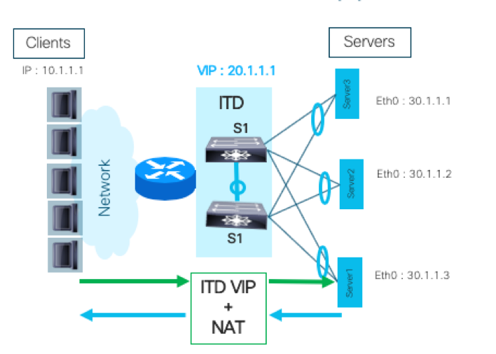 In the above example, clients send the traffic to the ITD virtual IP address (20.1.1.1), assuming it as real destination IP of the server. ITD switch translates and load balances the traffic to one of the server's private IP address by adding its own IP as the source IP. The return traffic from the server is translated by ITD to its own VIP as source IP and forwarded back to the client. This way the traffic gets load balanced across the servers behind NAT without exposing the real-IP of servers to clients.