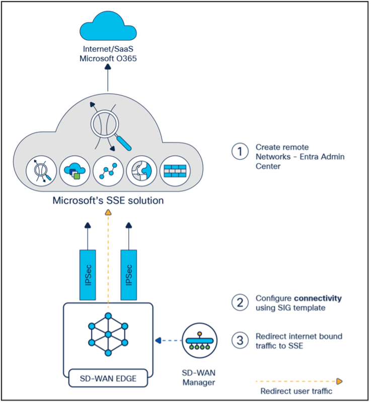 Cisco SD-WAN and Microsoft's SSE solution integration provides secure access to the internet and SaaS applications with an identity-centric secure web gateway (SWG). This integration enhances the security of branch internet traffic by efficiently redirecting it through Microsoft Entra Internet Access, part of Microsoft's SSE solution, for secure inspection, helping ensure that traffic from branch edges to the public internet or SaaS applications is thoroughly protected. The result is a secure networking solution that offers peace of mind and operational efficiency for enterprise customers.