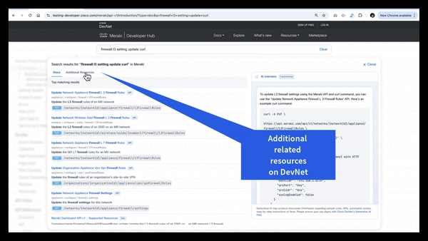 We invite you to try out these beta features at https://developer.cisco.com/meraki/api-v1/ and experience the improvements firsthand. Also check out video podcast as part of DevNet Decoded series. Your feedback is invaluable to us as we continue to refine and enhance our offerings. By exploring and using these new tools, you will be at the forefront of this innovative technology, helping us shape the future of API documentation and search experiences.