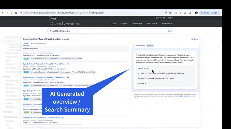 In today's fast-paced digital landscape, finding precise and relevant information is crucial. At DevNet, we continuously innovate to enhance the user experience and streamline how our users interact with our platform. Today, in collaboration with the Meraki API team, we are excited to announce the launch of our new AI-driven Semantic Search and Summarization beta feature for Meraki API documentation. This powerful new tool leverages advanced Artificial Intelligence (AI) and Large Language Models (LLMs) to revolutionize how users search and retrieve information, making it more accurate, efficient, and intuitive.