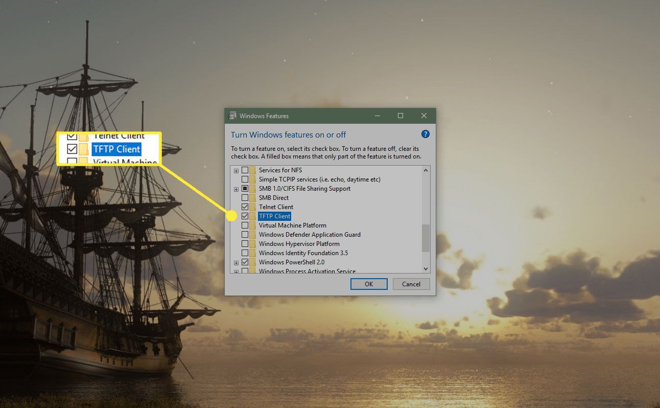 The TFTP client in Windows is not enabled by default. Turn it on through the Programs and Features Control Panel applet.