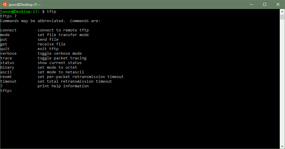 Access TFTP through Command Prompt with the tftp command. Use the help command or see the tftp command-line reference page on the Microsoft website.