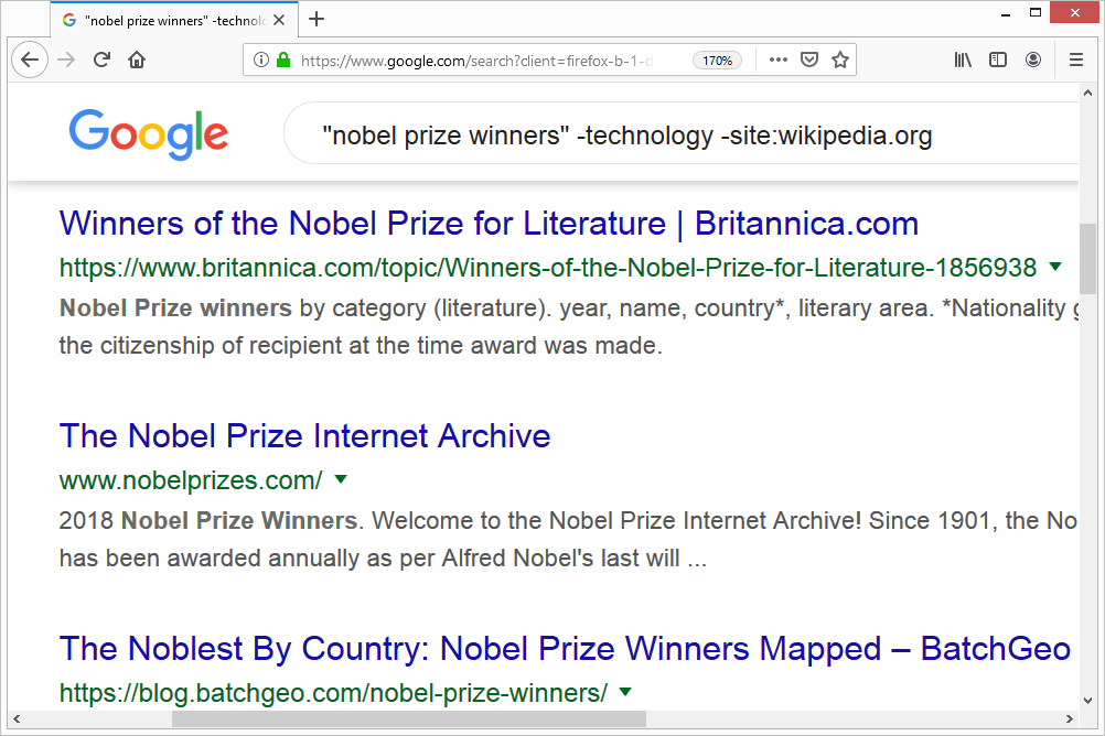 - Or: Exclude results with minus sign (ex. "nobel prize winners" -technology -site:wikipedia.org)