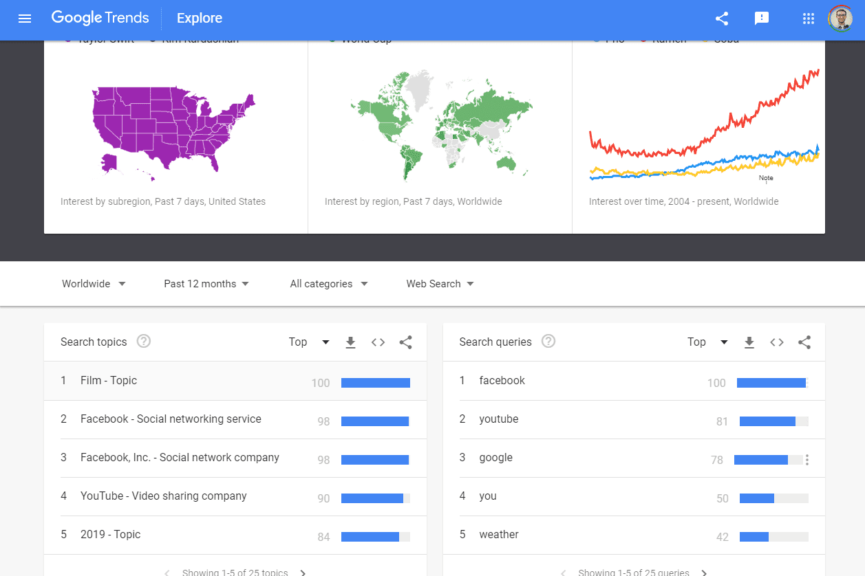 Visit the Explore page to see the current top searches and most popular search topics. You can change the tool to show rising search queries to find which search terms are performing better than they were the last time they were checked.