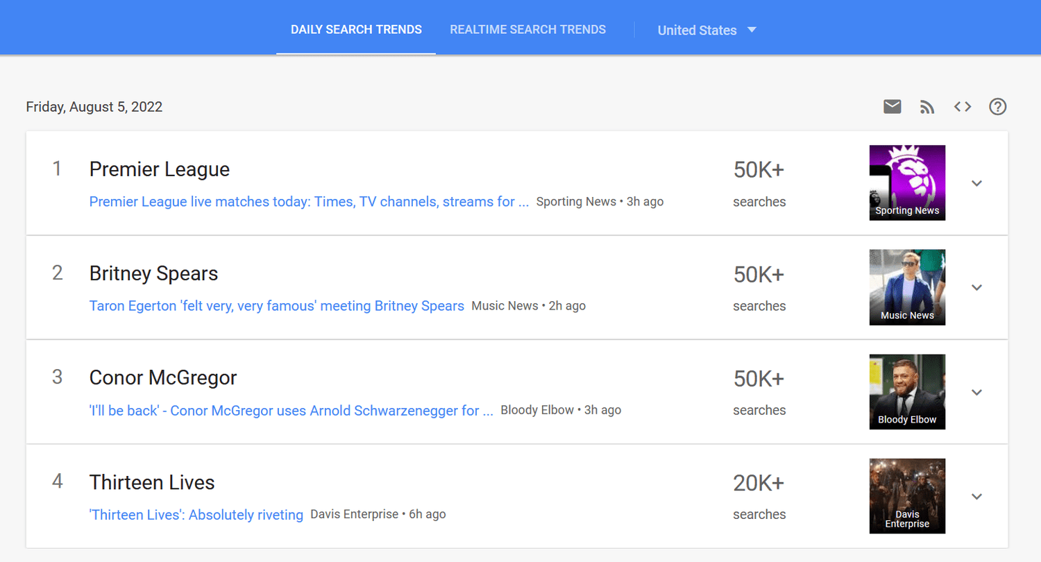 What are the most popular searches on any given search engine? Many search engines and other websites track the top searches users are performing on their platform, either in real-time or in archived lists that you can use to discover trends.