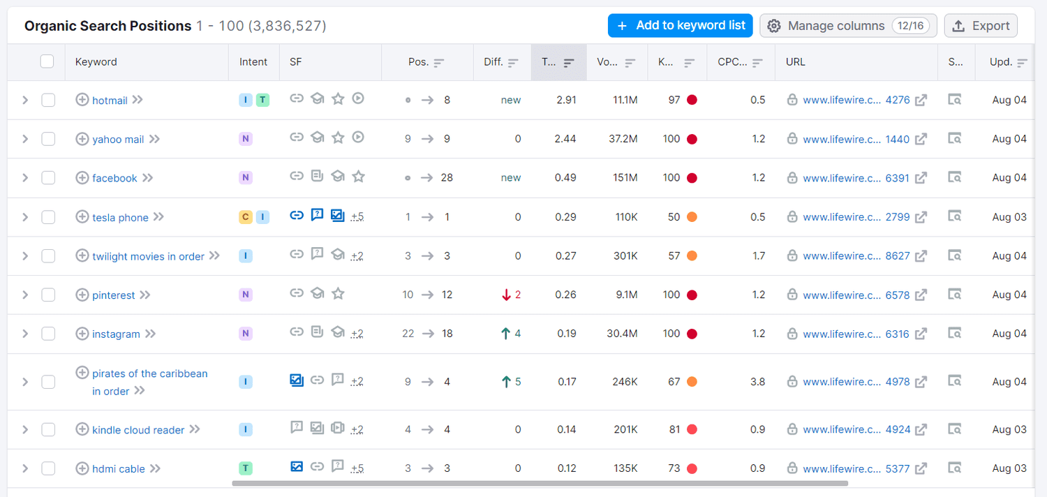 Enter any URL to see the top keywords by traffic and other search statistics. You can pay for deeper insights.