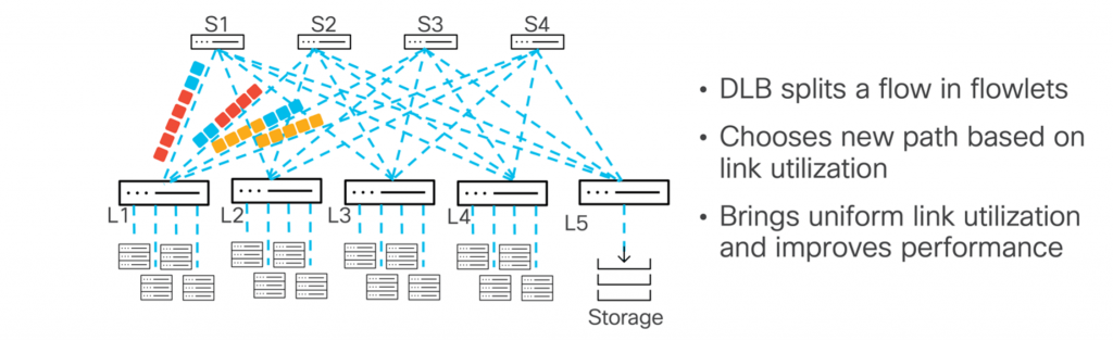 As the network state is constantly changing, load balancing needs to be dynamic and driven by real-time feedback from network telemetry or user configurations. Dynamic load balancing (DLB) allows traffic to be distributed more efficiently and dynamically by considering changes in the network. As a result, congestion can be avoided and overall performance improved. By continuously monitoring the network state, it can adjust the path for a flow-switching to less-utilized paths if one becomes overburdened.