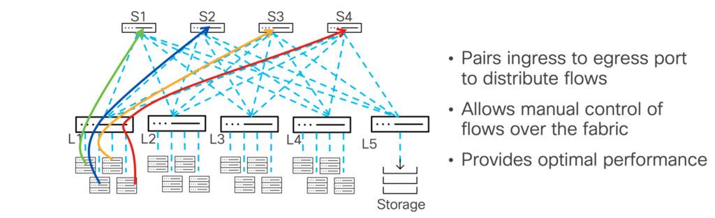 For those who like to be in control, the Nexus 9000 Series' DLB lets you fine-tune load balancing between input and output ports. By manually configuring pairings between the input and output ports, you can gain greater flexibility and precision in managing traffic. This allows you to manage the load on output ports and reduce congestion. This approach can be implemented via command-line interface (CLI) or application programming interface (API), facilitating large-scale networks and allowing manual traffic distribution.