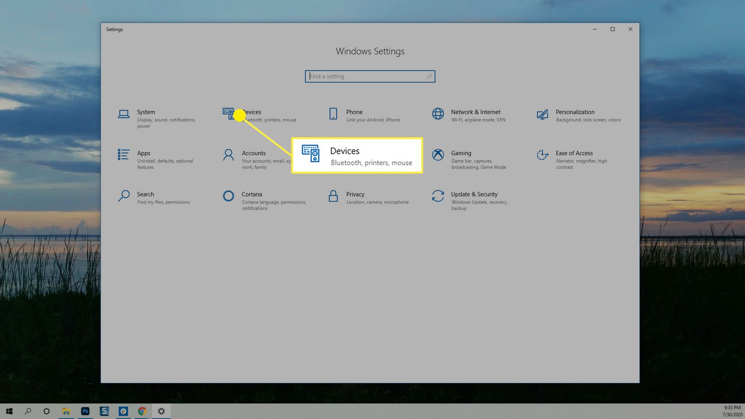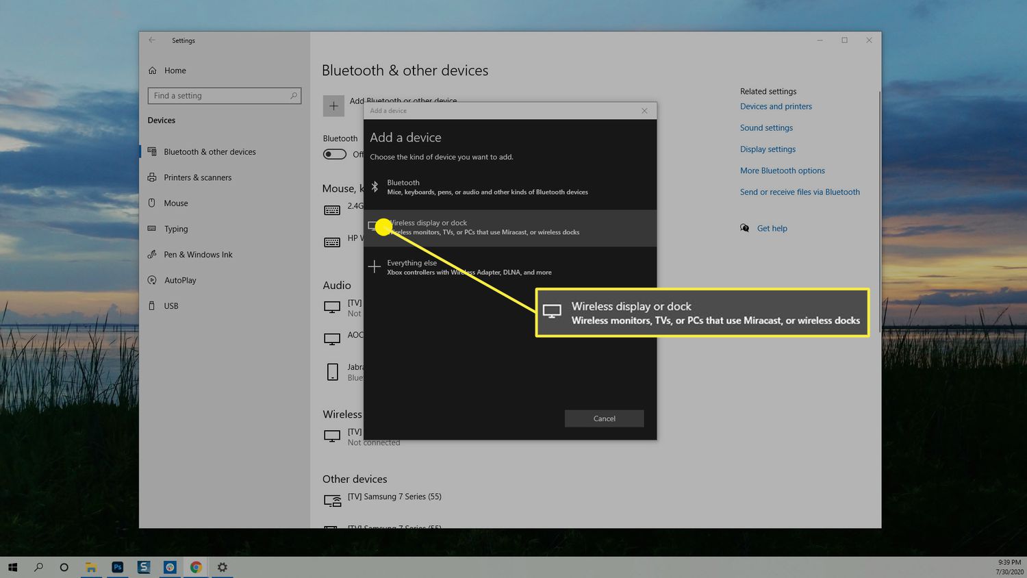 Make sure both your laptop and your TV are connected to the same network and then go to the Windows logo button (Start) > Settings > Devices.