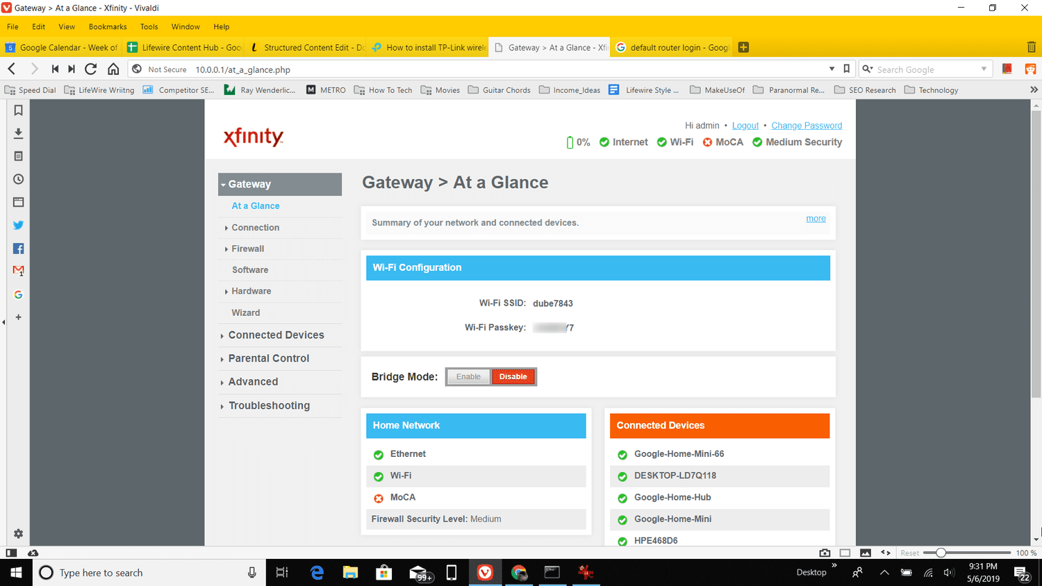 Open a web browser and enter the IP address listed in the ipconfig results for the Default Gateway. You'll see the login window for the router. If this is the first time you're logging into the router, the administration ID is usually admin, and the password is blank. You should see the Wi-Fi SSID and the Wi-Fi passkey either on the main router window or under the Wi-Fi menu.