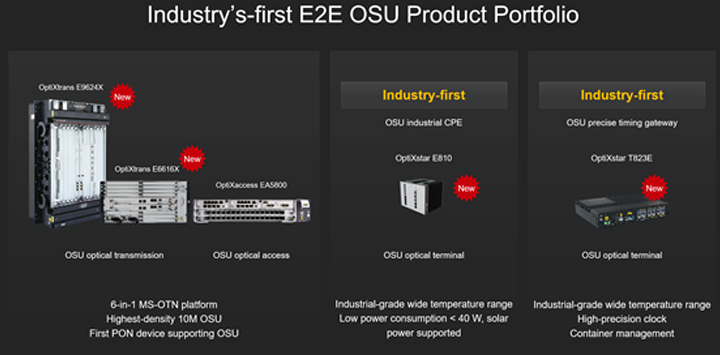 Industry's first end-to-end optical service unit (OSU) solution for production network scenarios such as electric power and transportation: As the basic component of a production system, the production communication network has high requirements on security and reliability. With the rapid development of emerging services such as unattended power line inspection, smart power distribution, and intelligent highway monitoring, production networks also require higher bandwidth. To meet such requirements, Huawei launched the industry's first end-to-end OSU solution based on the fifth-generation native hard pipe (NHP) technology - OSU. The OSU solution implements 100% physical isolation using NHPs from the backbone network to the access network, inherits traditional services, and breaks through the bandwidth restrictions of SDH. This solution provides unique benefits, such as end-to-end one-click service provisioning, one-click fault locating, and network-wide visualization and management, delivering the solid and reliable optical communication required for production management, real-time control, and integrated data services.