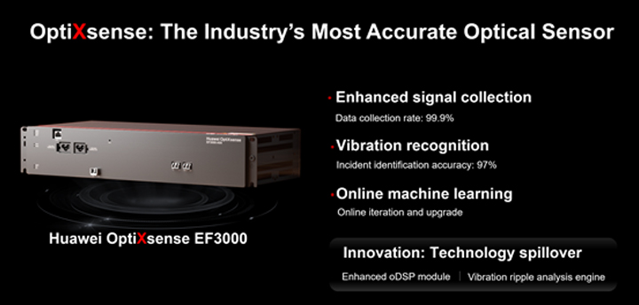 All-optical sensing solution for industry sensing scenarios: Building on 30 years of experience in optical technology innovation and application, as well as research into intelligent sensing algorithms, Huawei launched the first optical fiber sensing series product - OptiXsense EF3000. This product can be used in pipeline protection and perimeter protection scenarios. Based on Huawei's innovative oDSP and sensing algorithms, it provides over 95% event identification accuracy and meter-level sensing and locating, enabling enterprises to achieve highly accurate inspection.