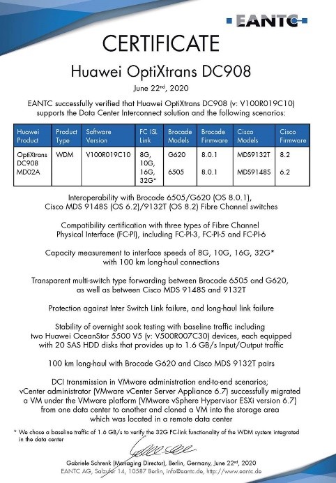 SAN certification is specifically for storage networks and is mandatory for vendors to enter the DCI market. It comprehensively tests the compatibility, reliability, and stability of storage network devices to ensure uninterrupted service. Huawei OptiXtrans DC908 successfully gained certification after passing all of the strict interoperability test cases designed by EANTC, which are based on real-world DCI service scenarios.