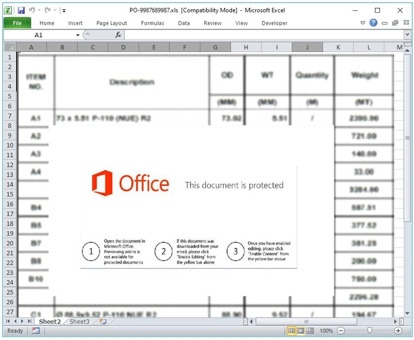 The phishing email is shown in Figure 2. It contains an attached malicious Excel file disguised as an order file to convince the recipient to open the document.