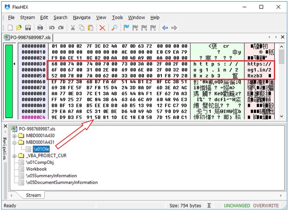 As you may know, a crafted embedded OLE object leads to this vulnerability. Figure 4 demonstrates the content of the crafted embedded OLE object ("\x01Ole").