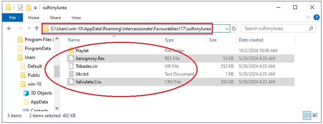 Once the downloaded EXE file, dllhost.exe, starts, it extracts a batch of files into the %AppData% folder. Figure 7 is a screenshot of the extracted files and sub-folders located in %AppData%\intercessionate\Favourablies117\sulfonylurea. Some of the key data are hidden in these files.
