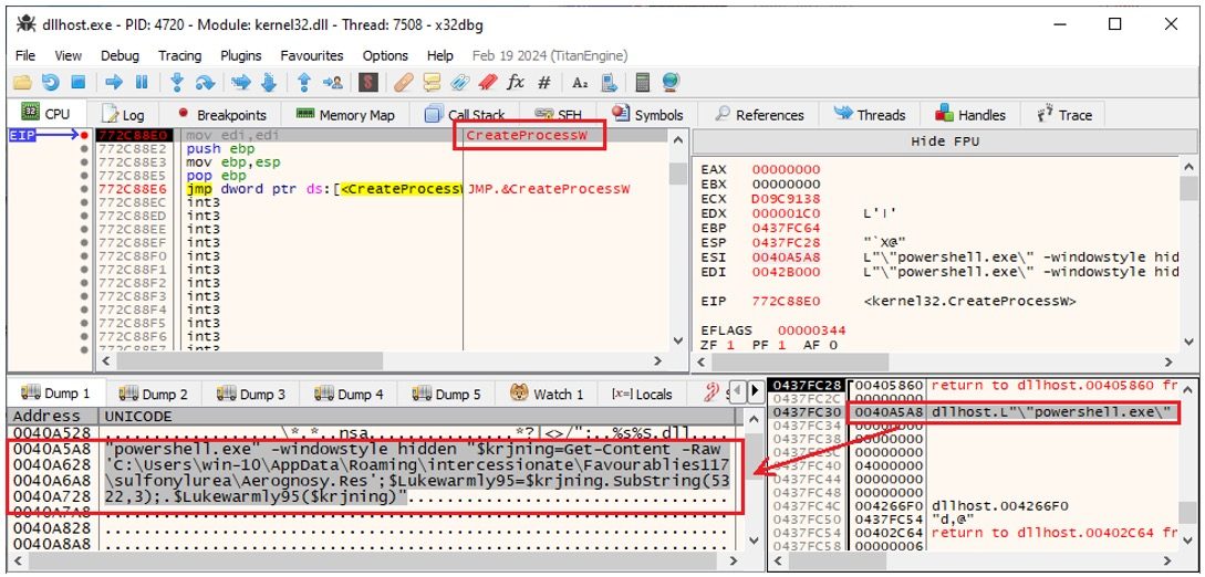dllhost.exe then runs the PowerShell program by calling the API CreateProcessW() to execute a piece of PowerShell code, as illustrated in Figure 8.