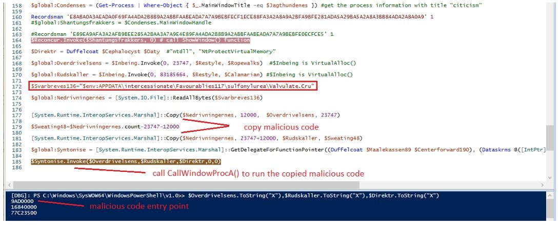 - Executes the malicious code's entry point by calling the API CallWindowProcA(), as listed in Figure 9.
