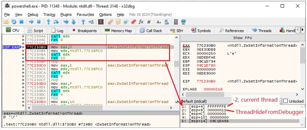 The malicious code calls API ZwSetInformationThread() with the argument ThreadHideFromDebugger (0x11) and the current thread (0xFFFFFFFE). This mechanism in Windows can conceal a thread's existence from debuggers. Figure 12 illustrates how it calls this API with the associated arguments.