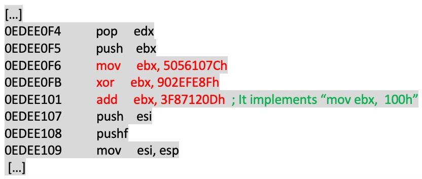 Please refer to the code snippet below to see how it splits "mov ebx 100h" into three instructions.