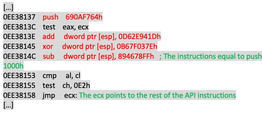 The malicious code simulates executing multiple API instructions (say, two instructions) at the beginning and then jumps to the API to execute the rest of the instructions (beginning with the 3rd instruction).